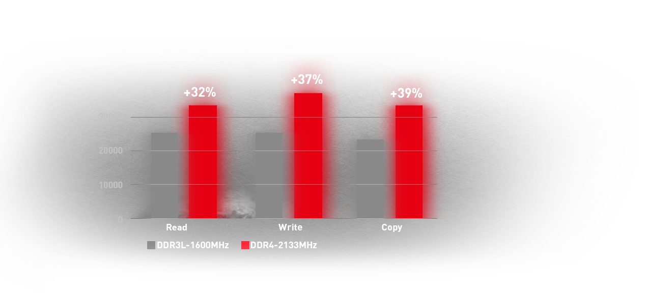 对比前一代DDR3-1600MHz内存效能,高速DDR4-2133 MHz内存不仅更低功耗,更领先30%以上效能表现,读取速度达2.9GB/s,写入速度可达3.5GB/s!让玩家感受高速内存存取体验。