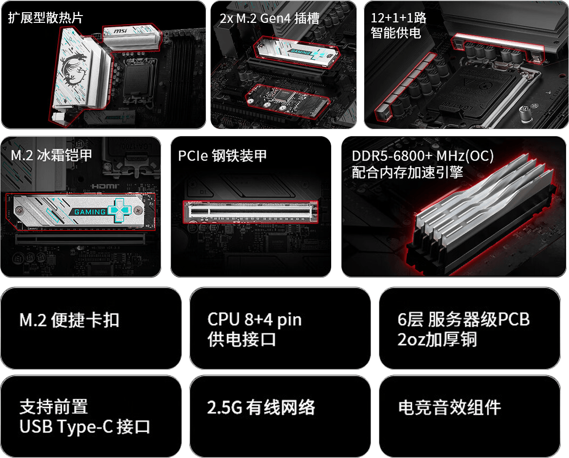 拓展型散热片和12+1+1路智能供电,提供了稳定的性能。2.5G有线网络和极速WiFi6。内存支持DDR5-6800+MHz(OC),支持前置USB Type-C接口,带来更好的游戏体验。