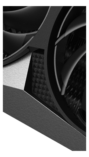 风扇罩微微延伸出外壳外以延长空气通道,并在风扇罩下设有凸出的槽口来减少气流再循环,从而大幅提高气流的稳定性并能降低噪音。