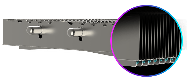 - 导流鳍片 2.0 : 位于气流通道处的导流鳍片带有V形切口和高低错落的设计,可以提升气流流动效率。