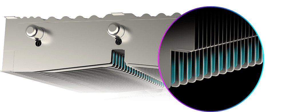 具有V形切口和高低设计的散热片鳍片被精确地放置在气流通过处,以减少气流阻力,优化散热效率,最大化冷却性能。