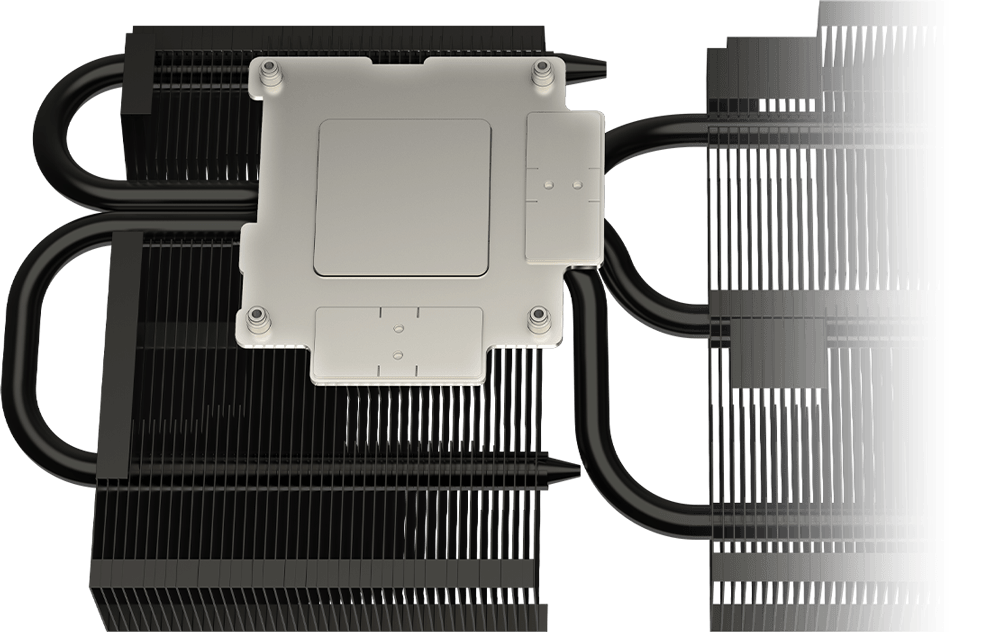 经过精密加工的方形核心热管能最大限度地利用空间,热管的方形部分能够充分接触覆盖于GPU核心上的底座表面,从而提升散热的效率。