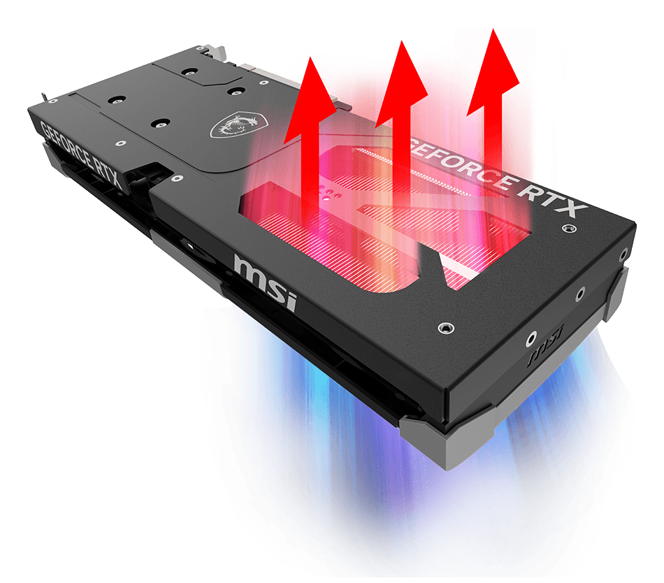 刀锋7代风扇是微星风扇设计进化的结晶,可提升风压并增加吹到散热鳍片上的气流,相比普通轴流风扇能增加23%。将三组倾斜22度的扇叶连接成环形的设计,使得在较慢的转速下也能保持高压气流,是微星显卡可以拥有如此静音效果的原因之一