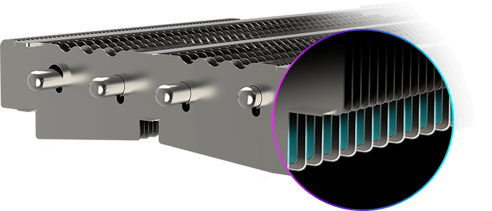 精细的波浪边缘采用高-低鳍片设计,以精确角度成波浪形。通过显著减少湍流并最大化散热,使风扇的气流得到改善,从而实现卓越的冷却效率。