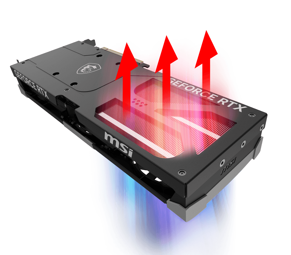 刀锋7代风扇是微星风扇设计进化的结晶,可提升风压并增加吹到散热鳍片上的气流,相比普通轴流风扇能增加23%。将三组倾斜22度的扇叶连接成环形的设计,使得在较慢的转速下也能保持高压气流,是微星显卡可以拥有如此静音效果的原因之一
