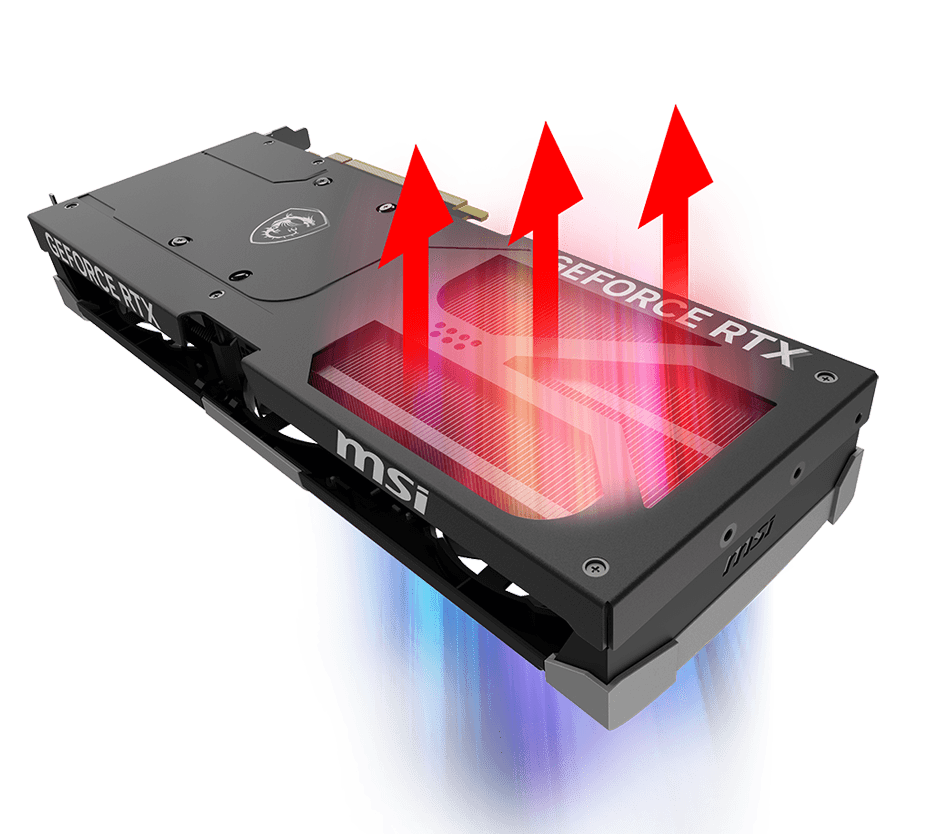 刀锋7代风扇是微星风扇设计进化的结晶,可提升风压并增加吹到散热鳍片上的气流,相比普通轴流风扇能增加23%。将三组倾斜22度的扇叶连接成环形的设计,使得在较慢的转速下也能保持高压气流,是微星显卡可以拥有如此静音效果的原因之一