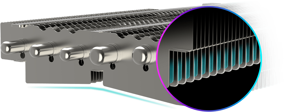 精细的波浪边缘采用高-低鳍片设计,以精确角度成波浪形。通过显著减少湍流并最大化散热,使风扇的气流得到改善,从而实现卓越的冷却效率。