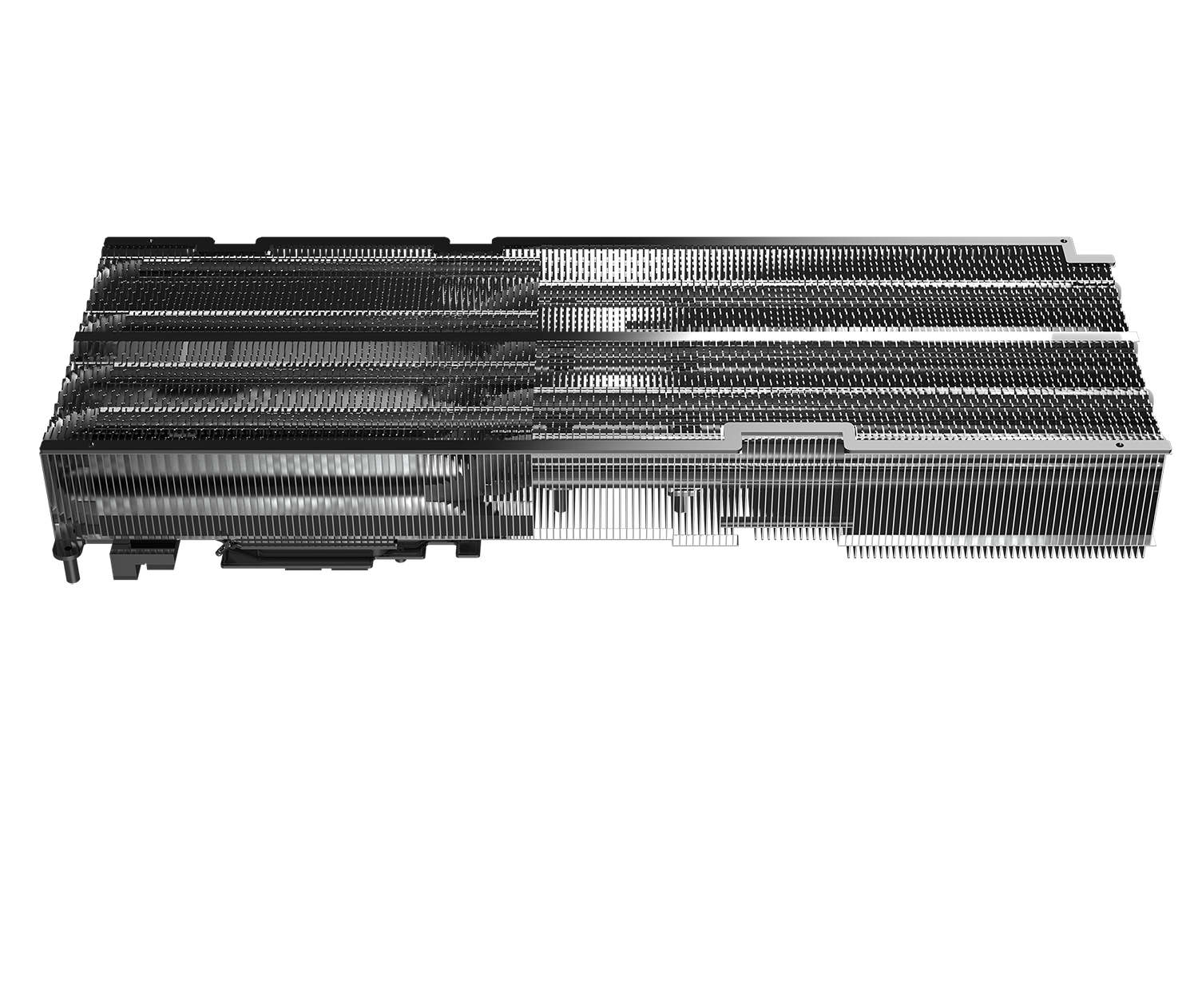 精确成型的散热鳍片完全占据了热模块空间,包裹着核心管道,以最大限度地减少紊流和回流,最终提高冷却性能和效率。