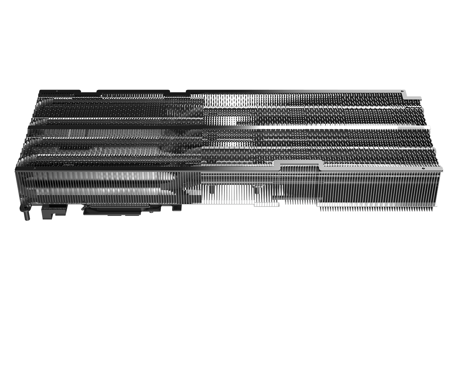 精确成型的散热鳍片完全占据了热模块空间,包裹着核心管道,以最大限度地减少紊流和回流,最终提高冷却性能和效率。