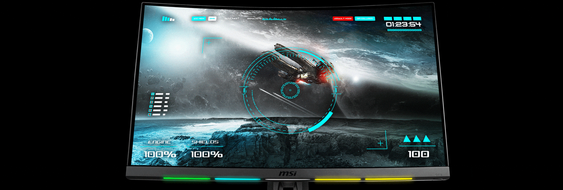 RGB系列曲面显示器,背面以科技电路板设计RGB灯条炫光,正面配置五区RGB灯条,玩家可通过微星与赛睿合作的GAMESENSE设定这五区的血量、子弹数等,让您畅游游戏世界时能时刻洞察游戏状态并能实时做出上佳应对,同时粉丝也能与微星电竞周边、主机进行灯光连动效果,是黑暗中亮眼的吸睛装备。