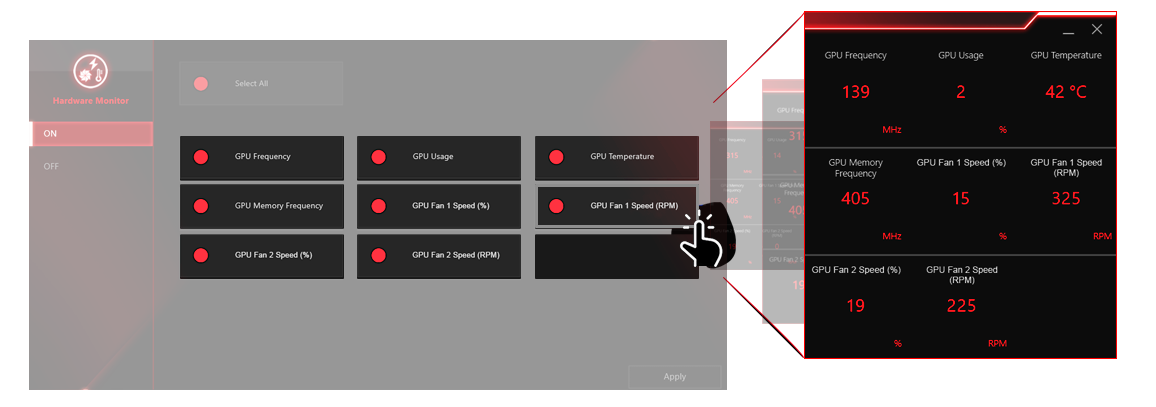 该功能可以实时显示关键的硬件信息,包括:温度,使用率,频率和电压,用户还可从中自行选择自己最关注的信息来显示。
