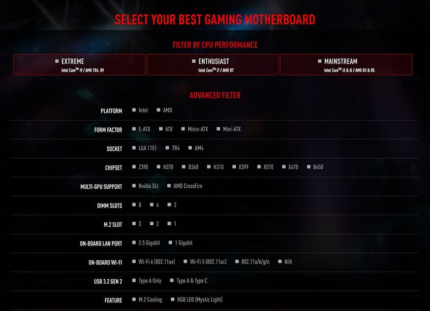 A g多数玩家在选择配备时,重心都放在CPU与显卡身上,忽略的主板的重要性。一块好的主板,不但能够给予你日后升级的无限可能,同时更是可以提供游戏专用的网络语音效支持,让你在游戏体验的时候可以更加的身历其境。透过微星的专属网站,可以协助玩家选择最适合你的主板,让你的游戏等级高人一等