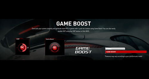 超频近年来已经越来越稳定,更有主板厂商研发一键超频,让原本复杂难懂的超频技术,简化成只需要点击即可执行。透过微星的Game Boost, 可以于Bios里面进行快速超频设定,根据不同的CPU选择,提供15%-25%不等的额外CPU / 显卡效能。