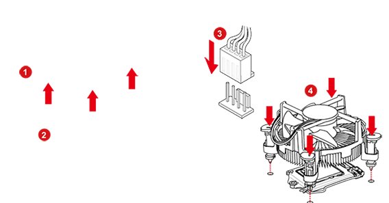 安装CPU散热器时,请确认散热器螺丝是否有锁紧,并尽量保持锁点压力平均,以避免CPU损坏或是散热不均的状况发生。