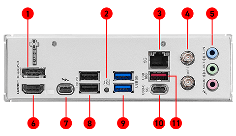 1x Thunderbolt4 ports (Rear)Supports up to 40Gbps transfer rate with Thunderbolt devices Supports up to 20Gbps transfer rate with USB4 devices Supports up to 10Gbps transfer rate with USB 3.2 devices Supports up to 5V/3A,15W power charging Each port can daisy-chain up to three Thunderbolt 4 devices or five Thunderbolt 3 devices Supports up to 8K display |