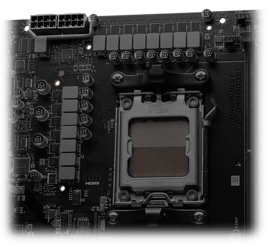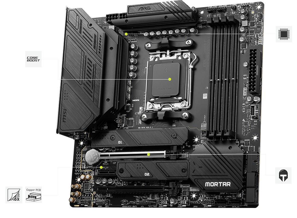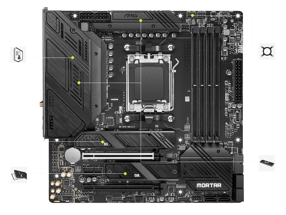 最新的DDR5 记忆体支援,为DDR 性能迈进一大步! 结合独家SMT焊接工艺和MSI Memory Boost 技术,MAG B650M MORTAR WIFI 为您激发更强悍的记忆体性能。