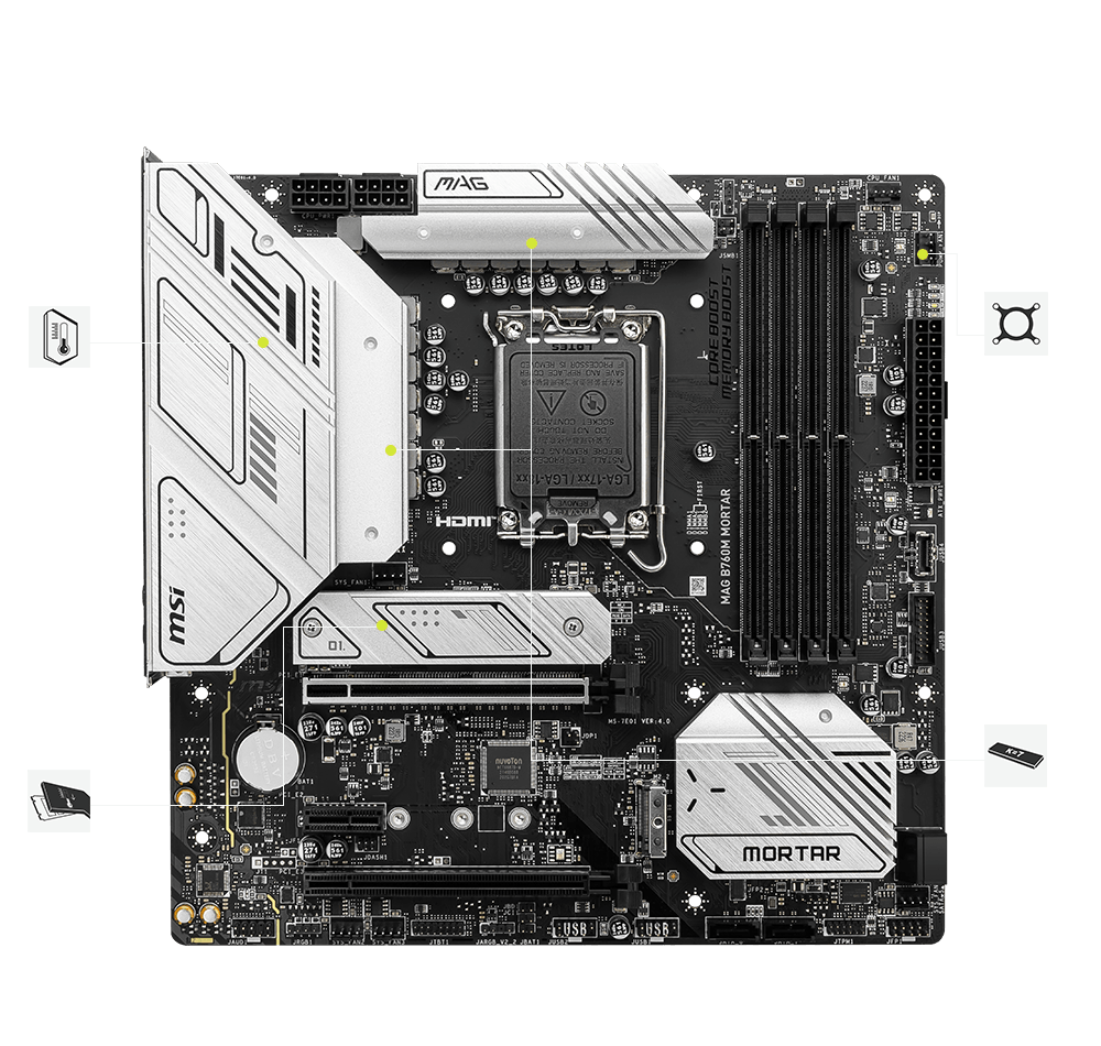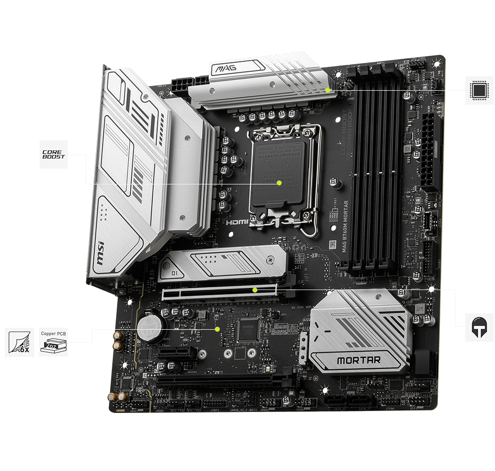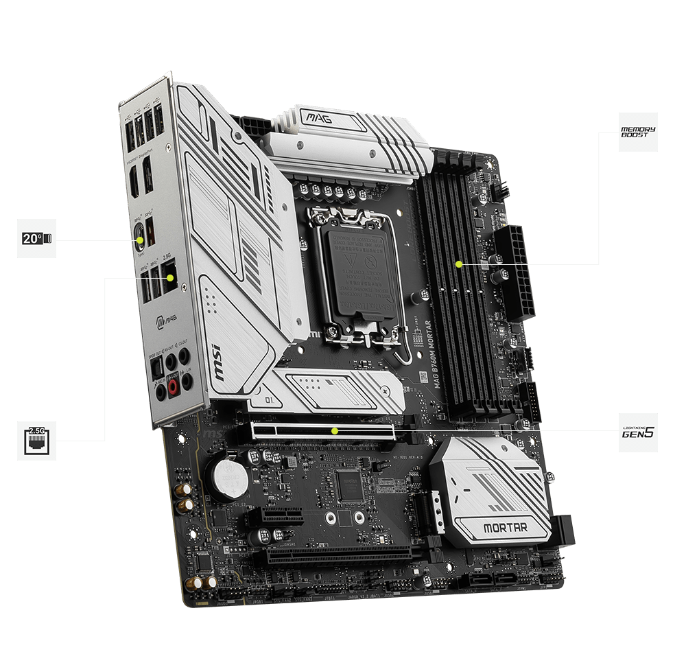 A huge step of DDR performance enhancement with the latest DDR5 memory. Combines with dedicated SMT welding process and MSI Memory Boost technology, MAG B760M MORTAR is ready to deliver the world class memory performance.