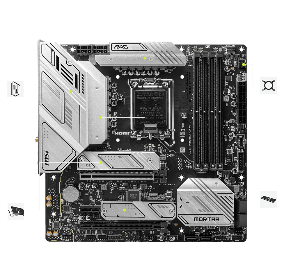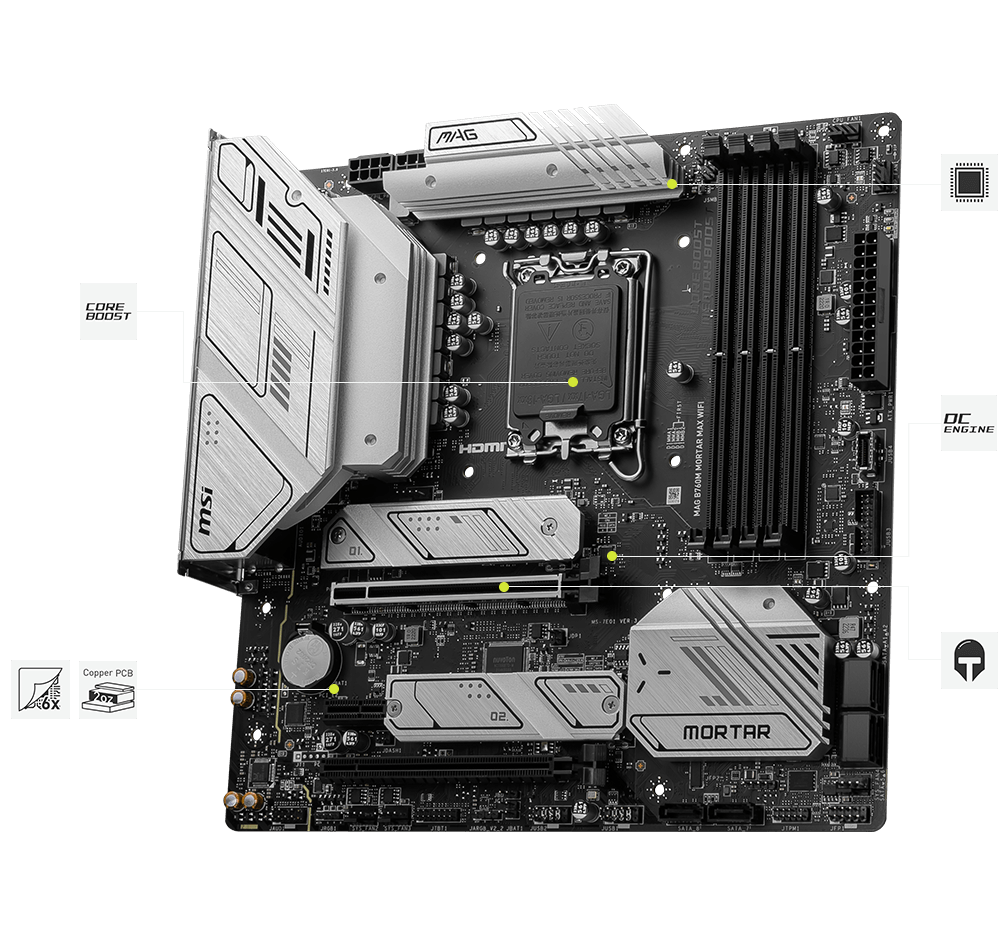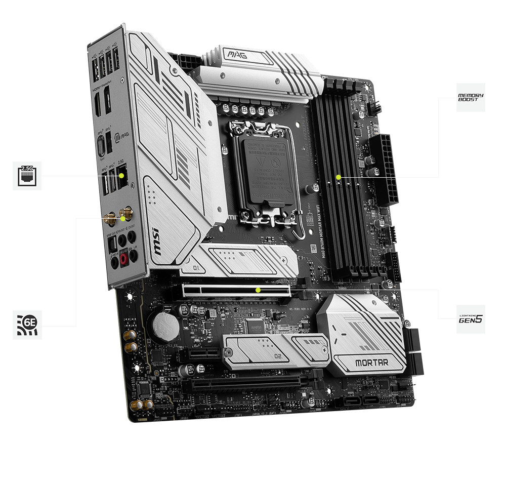 最新的DDR5 记忆体支援,为DDR 性能迈进一大步! 结合独家SMT焊接工艺和MSI Memory Boost 技术,MAG B760M MORTAR MAX WIFI 为您激发更强悍的记忆体性能。