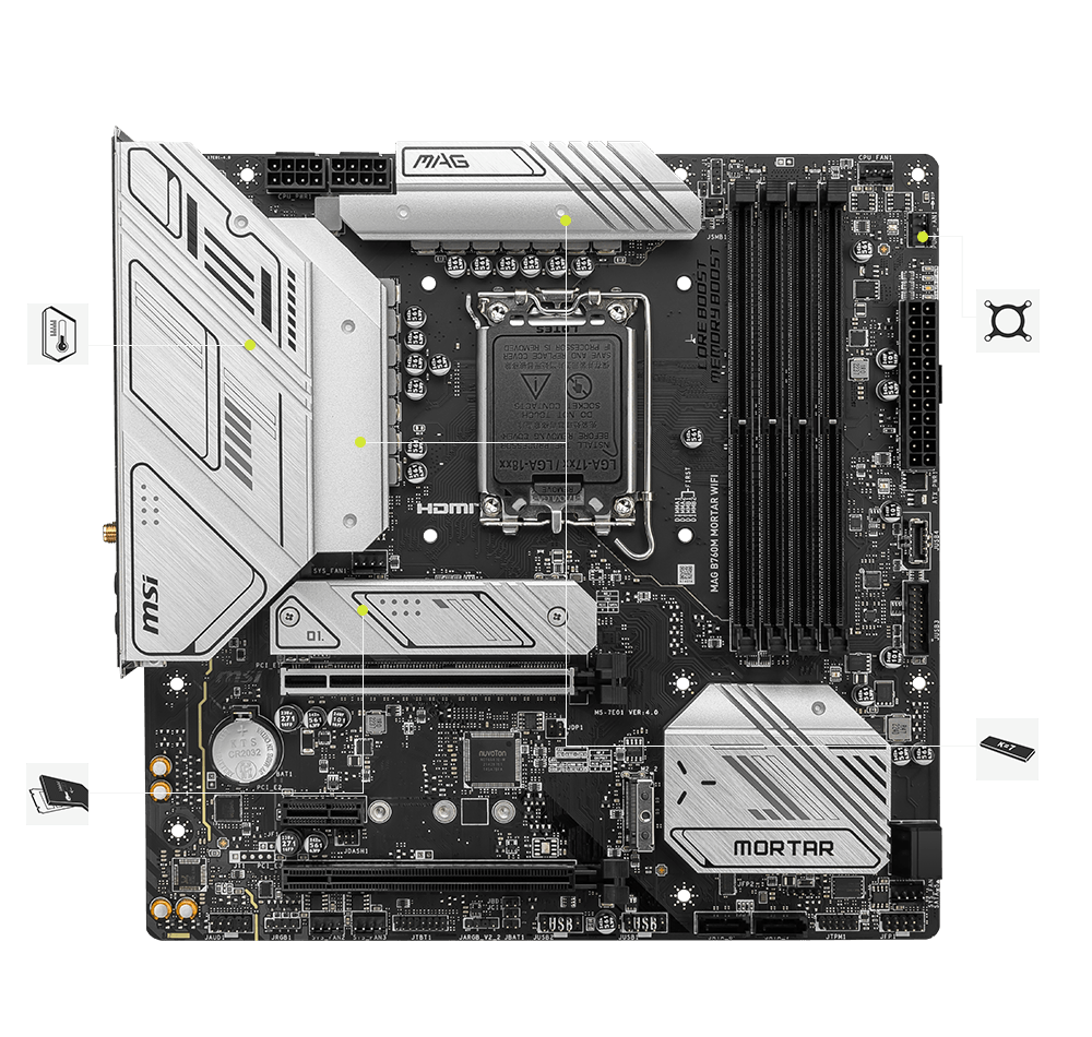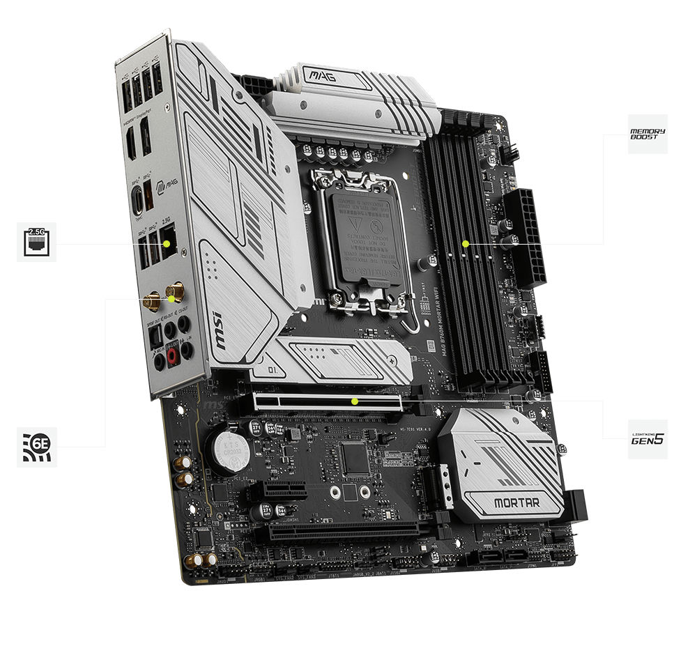 最新的DDR5 记忆体支援,为DDR 性能迈进一大步! 结合独家SMT焊接工艺和MSI Memory Boost 技术,MAG B760M MORTAR MAX WIFI 为您激发更强悍的记忆体性能。