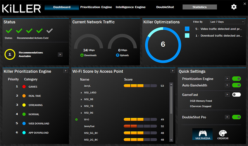 搭载Intel Killer LAN / Killer Wi-Fi配置,即可使用Intel Killer效能套件针对常用的应用程式作优先排序,同时,还能提供良好网路连线的选择建议。