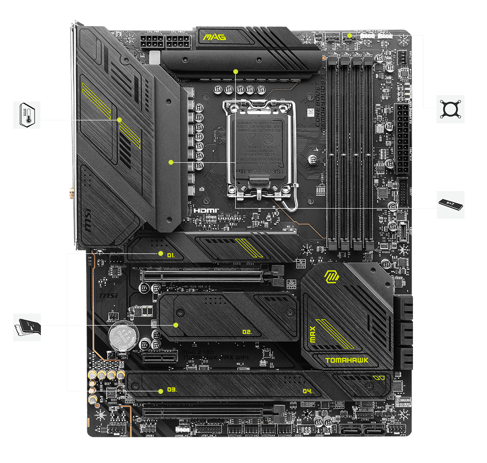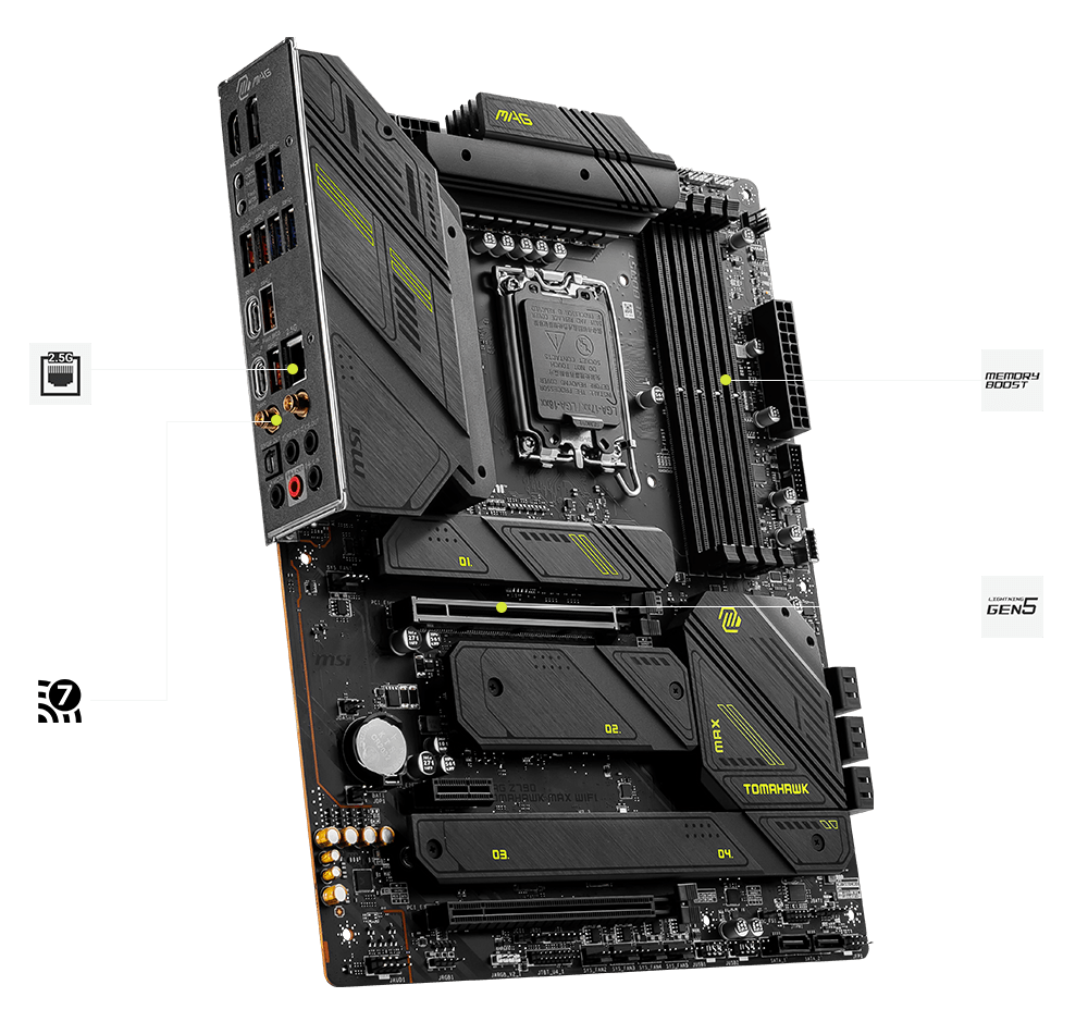 MAG Z790 TOMAHAWK MAX WIFI 专为游戏玩家设计,为主机打造稳定、坚固耐用的基础。其搭载Wi-Fi 7 网路解决方案、2.5G LAN、DDR5、PCIe 5.0 和独家M.2 Shield Frozr,为Intel® 下一代和第13 代酷睿处理器做好准备。