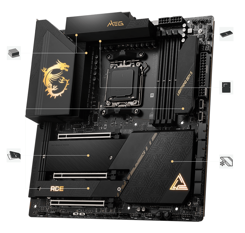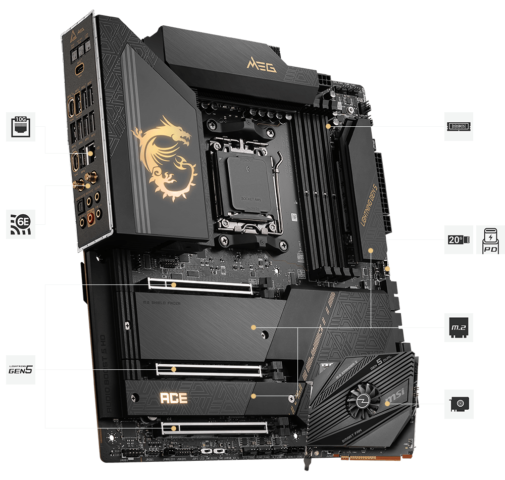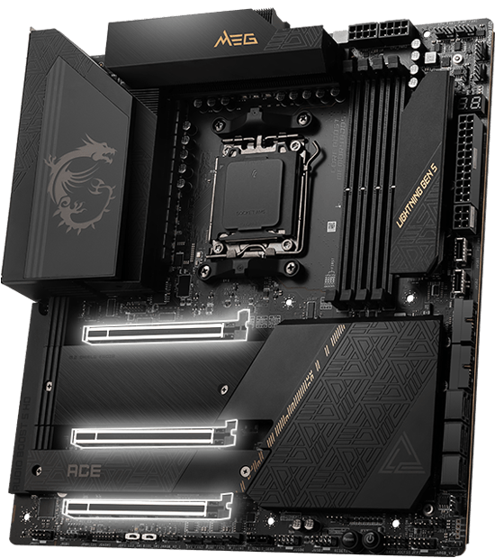 最新的DDR5 记忆体支援,为DDR 性能迈进一大步! 结合独家SMT焊接工艺和MSI Memory Boost 技术,MEG X670E ACE 为您激发更强悍的记忆体性能。