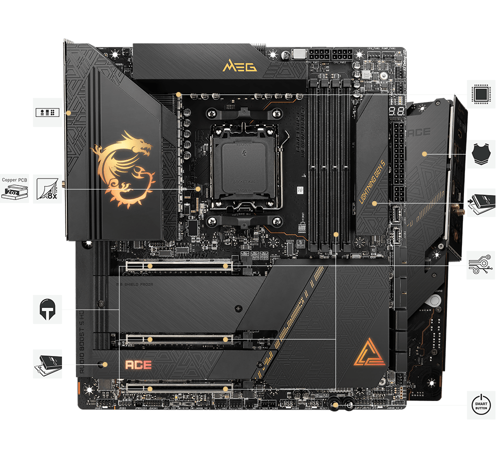 MEG X670E ACE 采用黑金装饰,彰显高级美学。结合卓越的规格技术,不断挑战记忆体最高频率。再搭配独家多项技术,让AMD X670 晶片组处理器、显示卡…等零组件优异潜能充分发挥,为您打造稳定出色的E-ATX 平台。