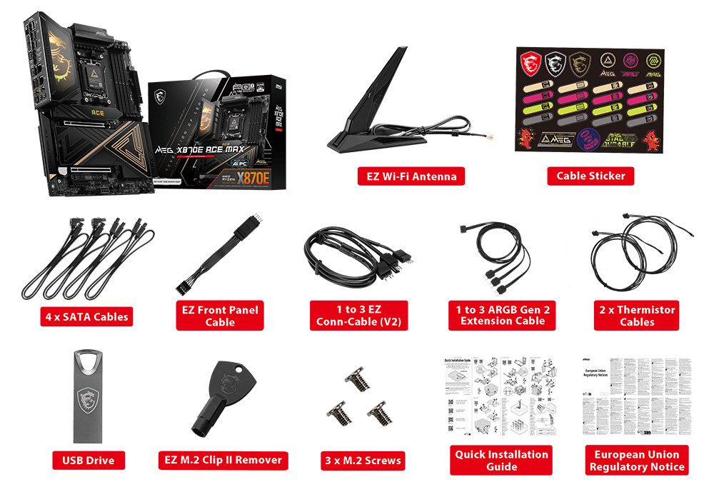 5x M.2 (Qty)M.2_1 源 (From CPU) supports up to PCIe 5.0 x4 , supports 2280/2260 devices M.2_2 源 (From CPU) supports up to PCIe 5.0 x4 , supports 2280/2260 devices M.2_3 源 (From Chipset) supports up to PCIe 4.0 x4 , supports 22110/2280 devices M.2_4 源 (From Chipset) supports up to PCIe 4.0 x4 , supports 2280/2260 devices M.2_5 源 (From Chipset) supports up to PCIe 4.0 x4 , supports 2280 devices 4x SATA 6G (Qty) M.2_1: • Supports up to PCIe 5.0 x4 (For Ryzen™ 9000/ 7000 Series processors) • Supports up to PCIe 4.0 x4 (For Ryzen™ 8000 Series processors) M.2_2: • Supports up to PCIe 5.0 x4 (For Ryzen™ 9000/ 7000 Series processors) • Supports up to PCIe 4.0 x4 (For Ryzen™ 8700/ 8600/ 8400 Series processors) * The M2_2 slot will be unavailable when using Ryzen™ 8500/ 8300 Series processors. ** M.2_1 & PCI_E3 share the bandwidth. M.2_1 will run at x2 speed when installing device in the PCI_E3 slot. You can switch M.2_1 slot to x4 in the BIOS, but this will disable the PCI_E3 slot. *** USB 40Gbps Type-C ports & M2_2 share the bandwidth. USB 40Gbps Type-C ports will run at x2 speed when installing device in the M2_2 slot. You can switch M.2_2 to x4 in the BIOS, but this will disable the USB 40Gbps Type-C ports. **** Please refer to the manual for M.2 SSD heatsink restrictions. |