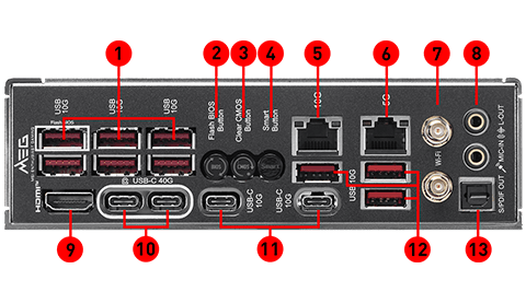 1x HDMI™Support HDMI™ 2.1 FRL, maximum resolution of 8K 60Hz*2x Type-C DisplayPortUSB4® port, supporting DisplayPort 1.4 with HBR3 over USB Type-C, maximum resolution of 4K@120Hz** Available only on processors featuring integrated graphics. ** Graphics specifications may vary depending on the CPU installed. |