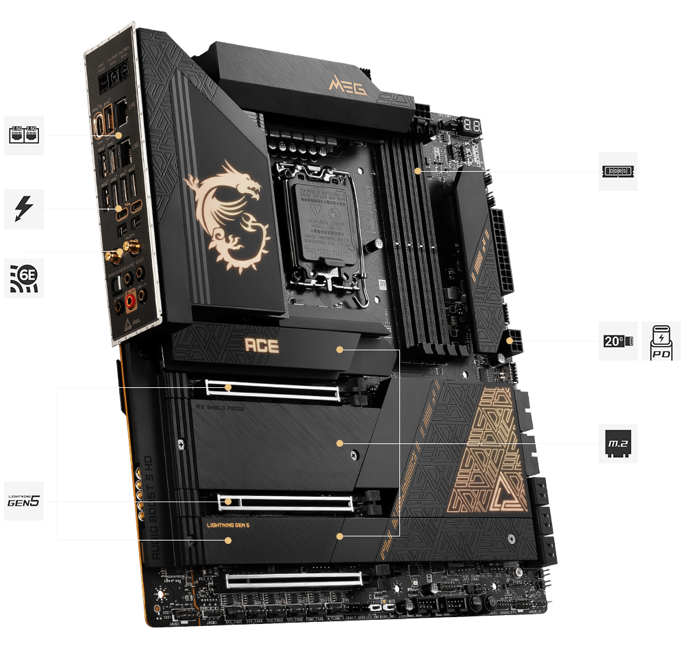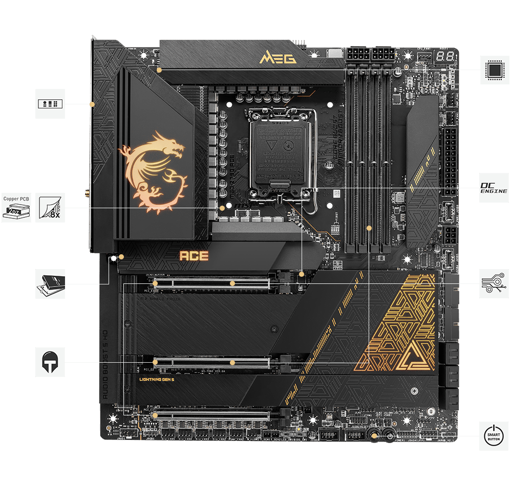 MEG Z790 ACE 采用黑金装饰,彰显高级美学。结合卓越的规格技术,不断挑战记忆体最高频率。再搭配独家多项技术,让Intel® Core 处理器、显示卡…等零组件优异潜能充分发挥,为您打造稳定出色的E-ATX 平台。