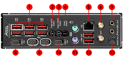 2x Thunderbolt4 ports (Rear)Support up to 40Gbps transfer rate with Thunderbolt devices Support up to 20Gbps transfer rate with USB4 devices Support up to 10Gbps transfer rate with USB 3.2 devices Support up to 5V/3A,15W power charging Each port can daisy-chain up to three Thunderbolt 4 devices or five Thunderbolt 3 devices Support up to 8K display |