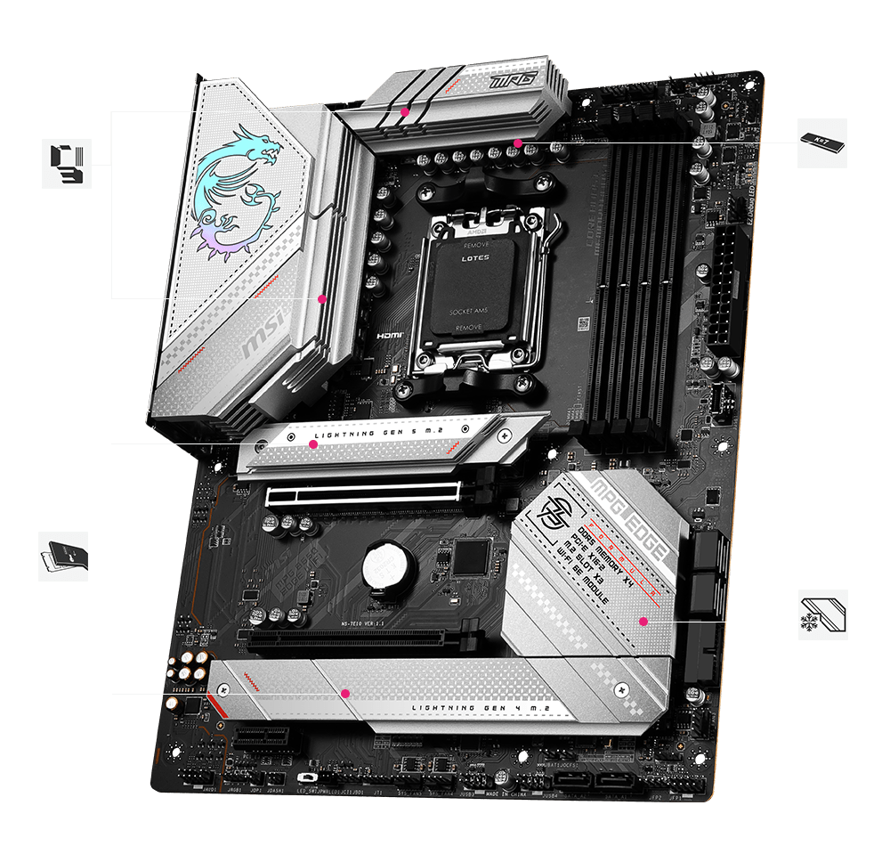 MPG B650 EDGE WIFI employs silver white color scheme to show off different personality and identity. Besides being stylish, it is also powerful.