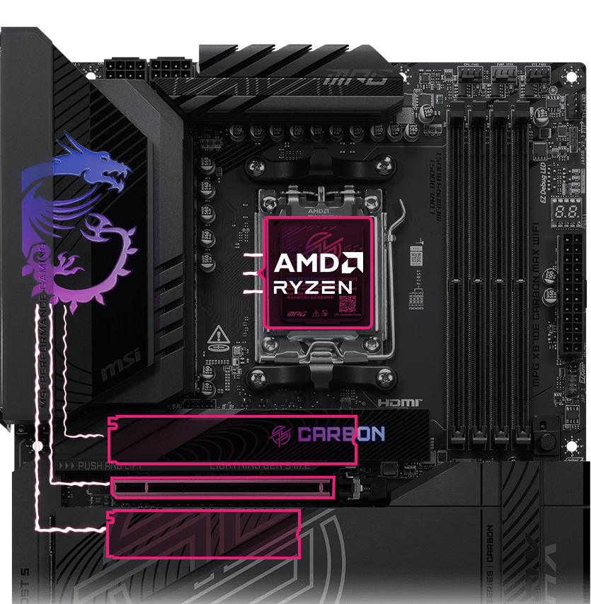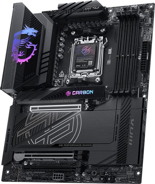 MPG X870E CARBON MAX WIFI employs a carbon black color scheme and reflection decoration over Mysticlight RGB lighting to show a different identity. It is also powerful inside by featuring OC Engine, Wi-Fi 7, 5G + 2.5G LAN , and the latest PCIe 5.0 M.2 with EZ M.2 Shield Frozr II, making this motherboard one of the best X870 ATX motherboards for AMD Ryzen 9000 processors.