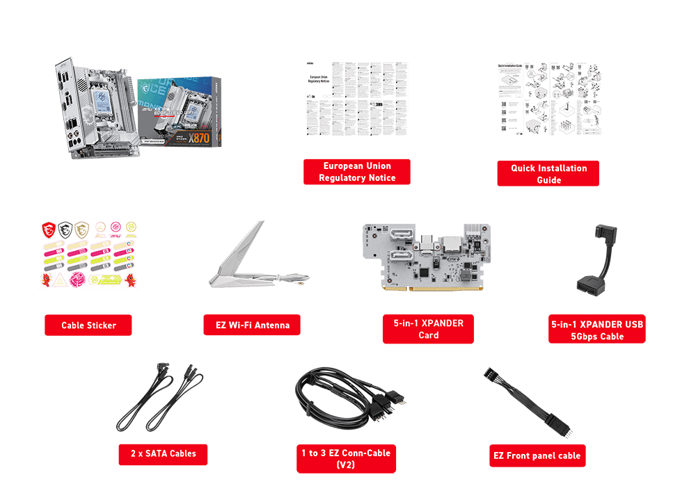 1x M.2 (Qty)M.2_1 源 (From CPU) supports up to PCIe 5.0 x4 , supports 2280 devices M.2_2 源 (From Chipset) supports up to PCIe 4.0 x4 , supports 2280 devices M.2_3 源 (From Chipset) supports up to PCIe 4.0 x4 , supports 2280 devices 2x SATA 6G (Qty) M.2_1 slot (From CPU) • Supports up to PCIe 5.0 x4 (For Ryzen™ 9000/ 7000 Series processors) • Supports up to PCIe 4.0 x4 (For Ryzen™ 8000 Series processors) M.2_2 slot (From X870 chipset) • Supports up to PCIe 4.0 x4 • Supports 2280 storage devices • Supports single sieded M.2 SSD only 5-in-1 XPANDER Card M.2_3 slot (From X870 chipset) • Supports up to PCIe 4.0 x4 • Supports 2280 storage devices • Supports single sided M.2 SSD only |