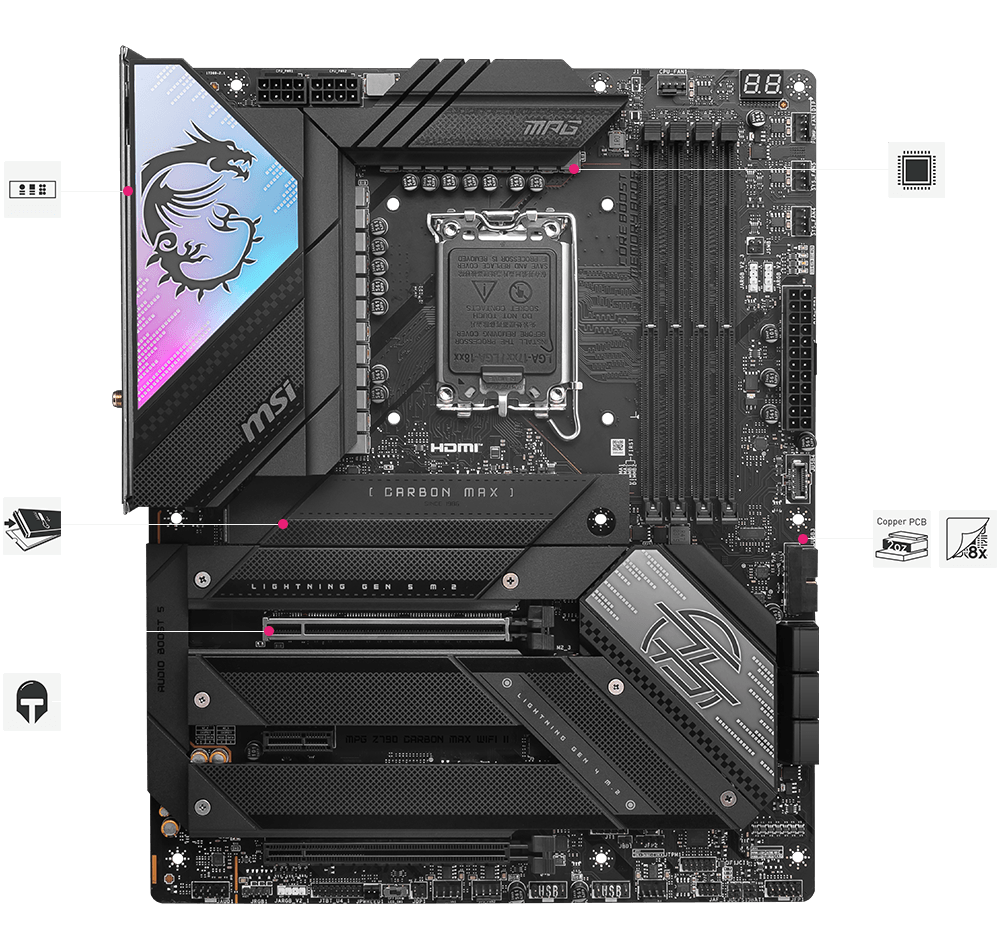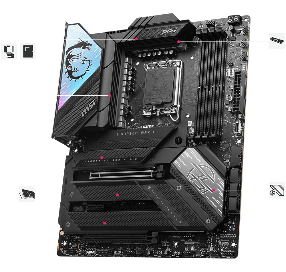 MPG Z790 CARBON MAX WIFI II 采用碳纤维黑的配色和装饰方案,配合RGB灯效彰显独特的个性。它的硬件规格也同样强大,配备了Wi-Fi 7无线网络,优化布线的DDR5内存加速引擎,以及最新的PCIE 5.0 M.2与免工具M.2冰霜铠甲,使其成为英特尔®第14代和第13代酷睿处理器搭配的最佳Z790 ATX主板之一。