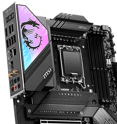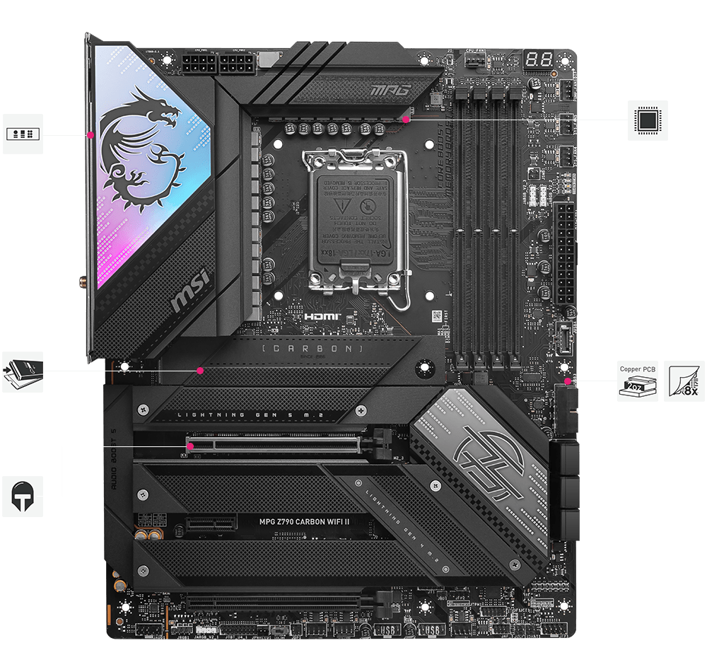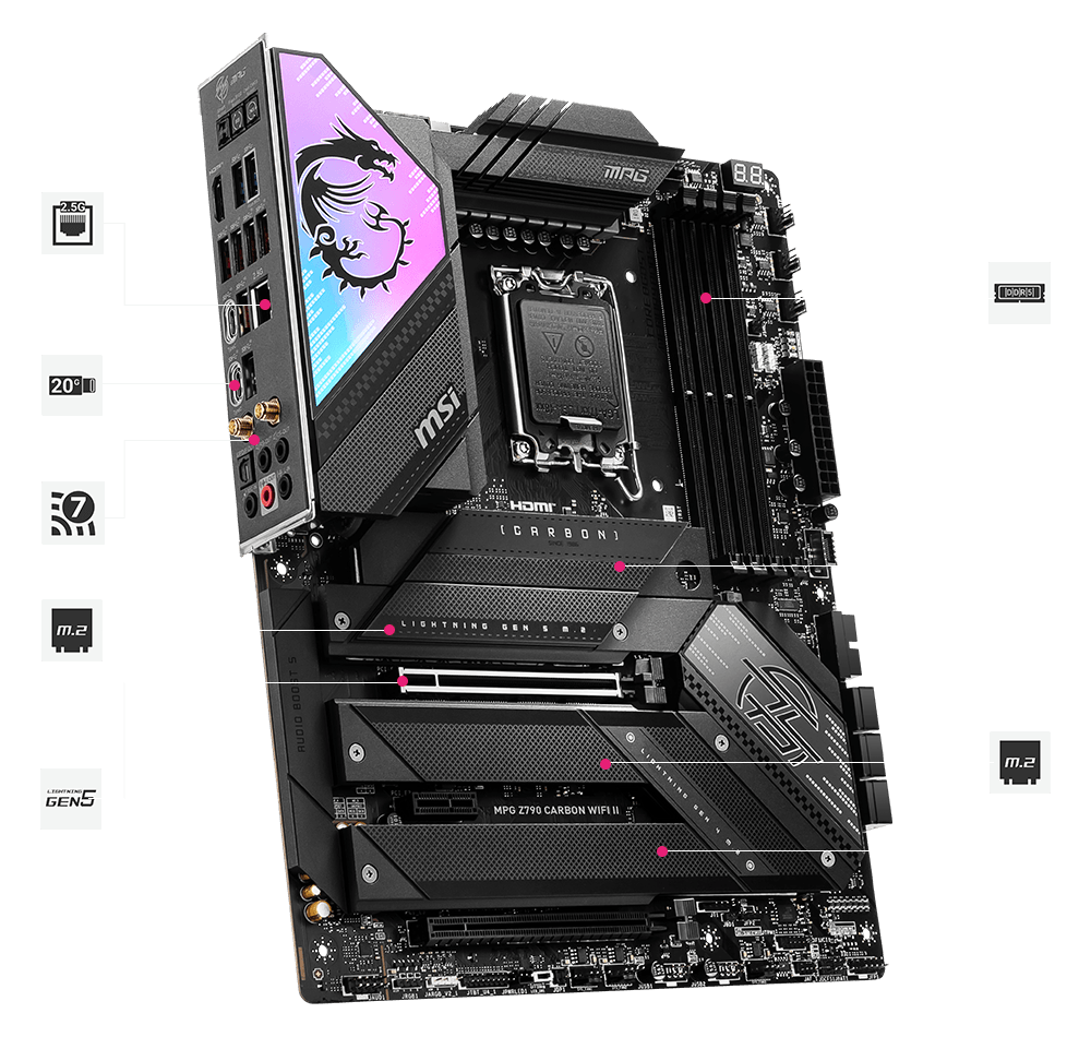 MPG Z790 CARBON WIFI II 采用碳纤维黑,搭配Mystic light RGB 灯效控制,自我展现自己的风格喜好。同时搭载强悍技术,Wi-Fi 7 连线解决方案、优化的DDR5 电路配置以及最新的PCIe 5.0 M.2 和无工具拆卸设计的M.2 Shield Frozr,让主机板成为Intel ®下一代和第13代最好的平台。