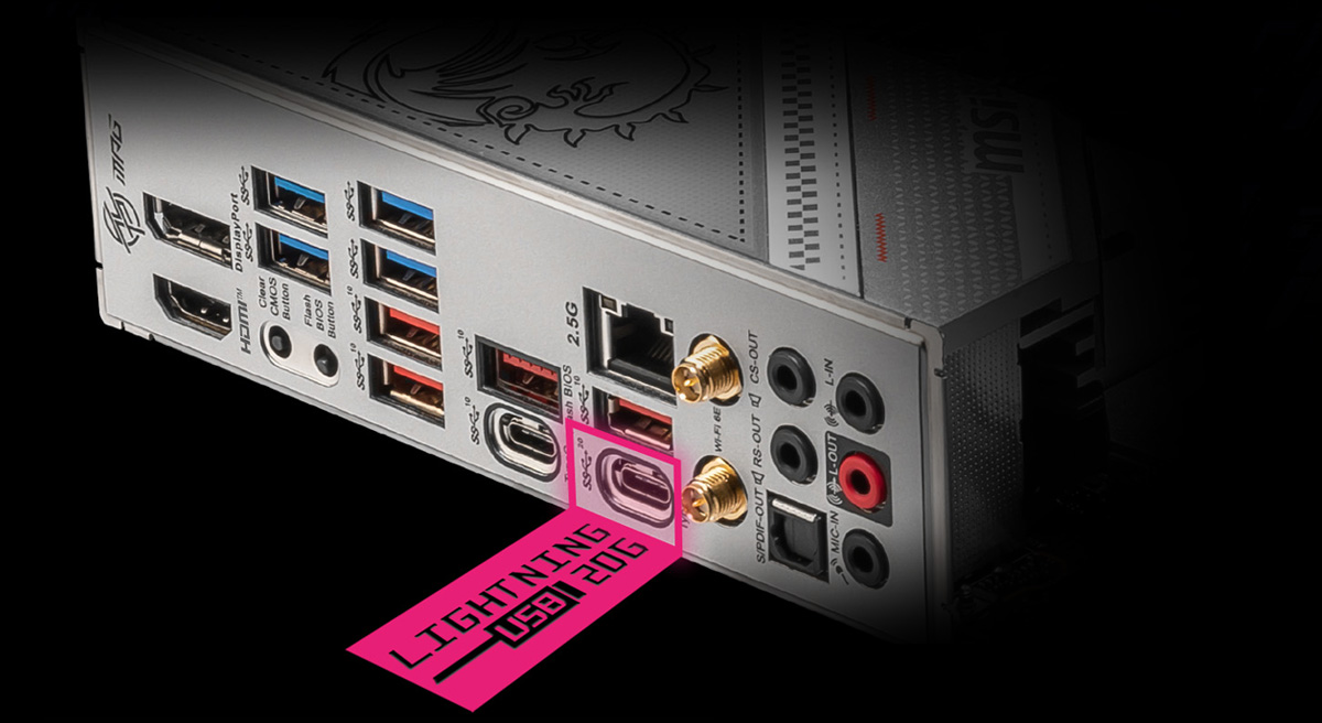 USB 3.2 前所未有的快速! MPG Z790 系列主板提供多种选择可增强USB 装备的传输速度,同时搭载后置USB Type-C ,传输速度更高达20Gb/s 。