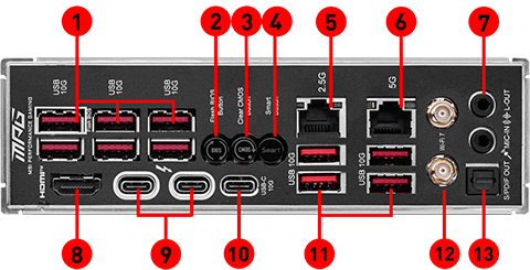 1x HDMI™Support HDMITM 2.1 with FRL port, maximum resolution of 8K 60Hz*2x Type-C DisplayPortThundeboltTM 4 ports, supporting DisplayPort 2.1 with UHBR20 over USB Type-C, with a maximum resolution of 4K@120Hz / 8K@60Hz* *Available only on processors featuring integrated graphics. Graphics specifications may vary depending on the CPU installed. |