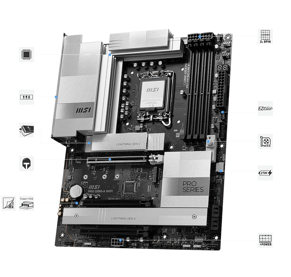 PRO Z890-A WIFI 采用简洁设计,搭配和谐银色配色,不论是白色机壳还是黑色机壳,皆能完美契合。其搭载多项MSI独家功能,包括全速的Wi-Fi 7、EZ天线、5G LAN、 Thunderbolt 4、 PCIe 5.0 M.2 搭配第二代EZ M.2 Shield Frozr 散热铠甲,以及PCLE拓源架构设计,为Intel ® Core™ Ultra系列处理器做好准备。