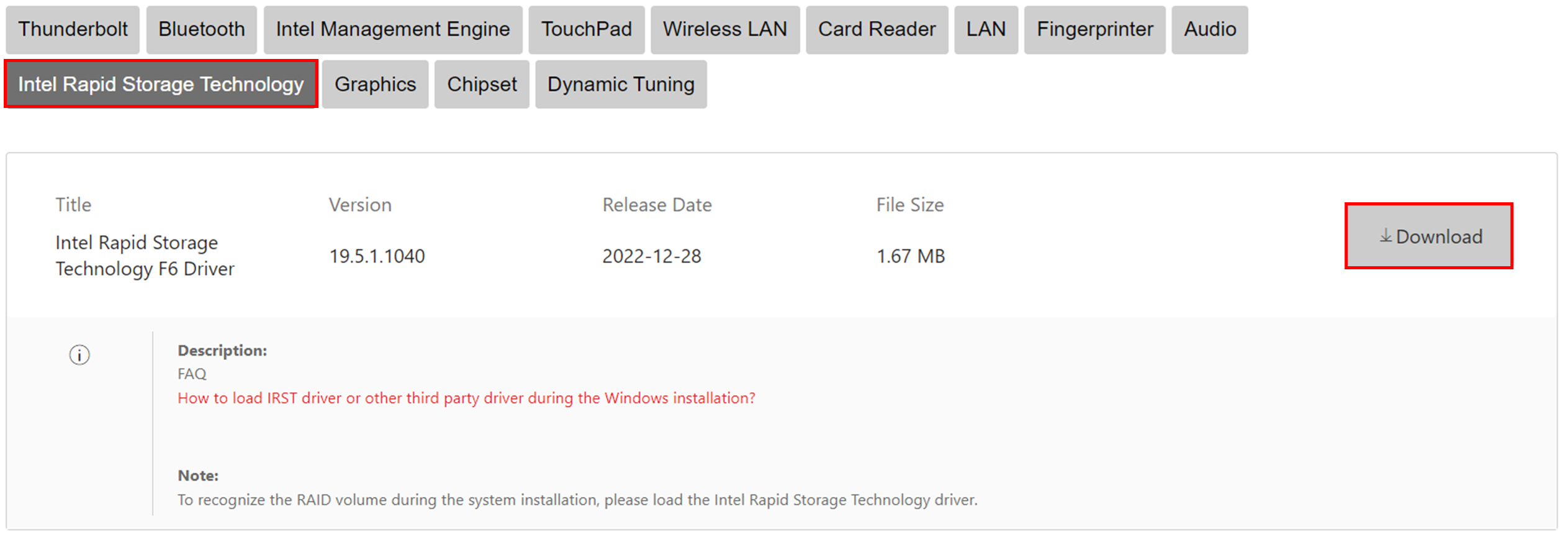 1. 从MSI官网产品支援页面下载「Intel Rapid Storage Technology F6 Driver」,解压缩驱动并储存在一个USB储存装置中。