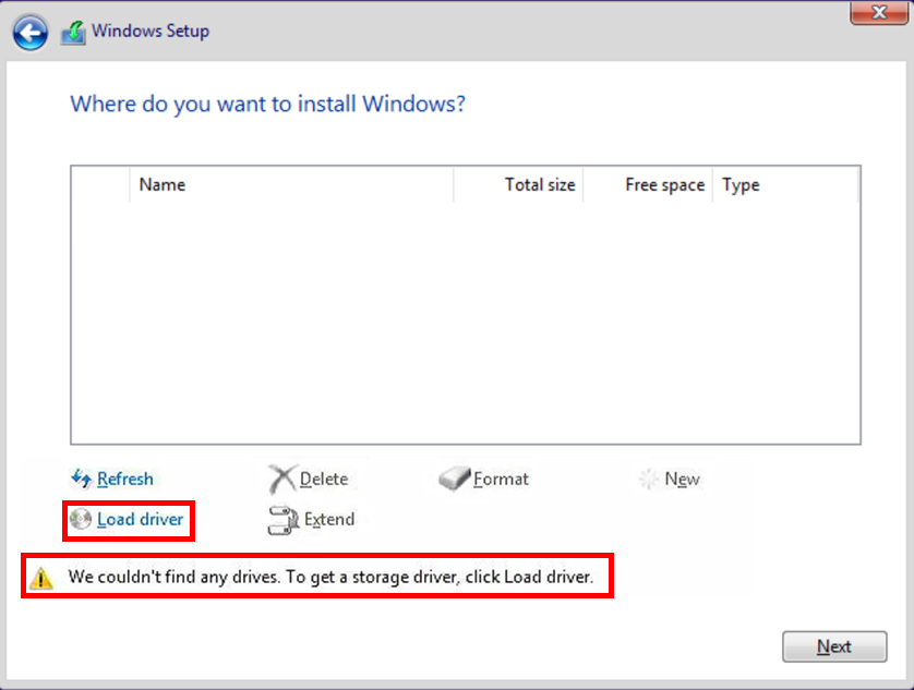 2. 安装Windows的过程中,当跳出以下视窗询问安装的磁碟位置时,点选「Load driver」。
