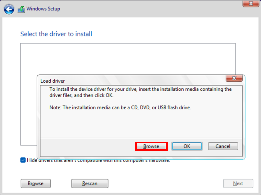 3. 插入预先准备好的USB储存装置,当「Load driver」视窗跳出时,点选「Browse」。