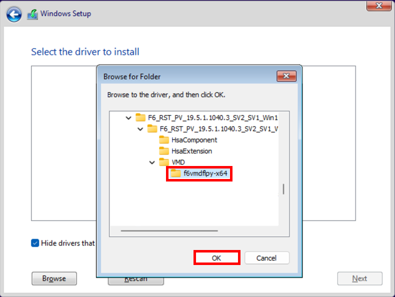 4.2 F6驱动版本19.x,点选VMD文件夹下的「f6vmdflpy-x64」文件夹,并点选「OK」。