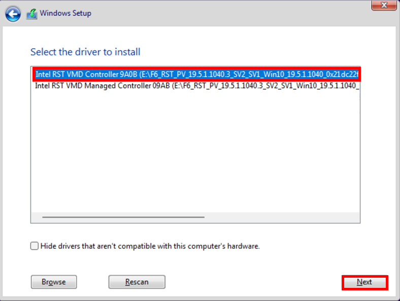 5. 从列表中选择「RST VMD Controller」,点选「Next」安装驱动。