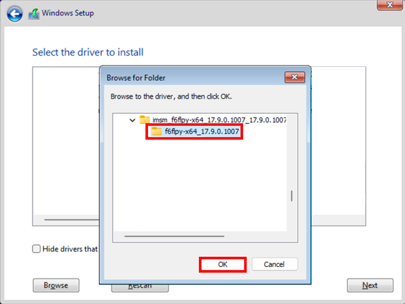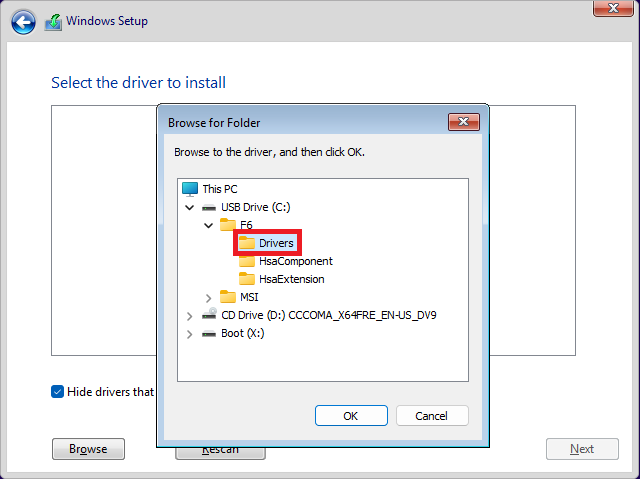 *针对搭载 Intel 10th 或更旧世代CPU的笔电,请选择在根目录下的「f6flpy-x64」资料夹,并点选「OK」。