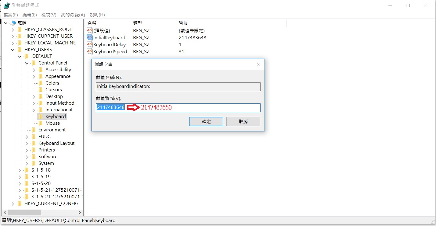 如需变更Windows下NumLock的默认值,可以透过Regedit更改登录码,修改登录码是有风险的,如果没有把握,建议不要变更修改,下列将以Windows10示范