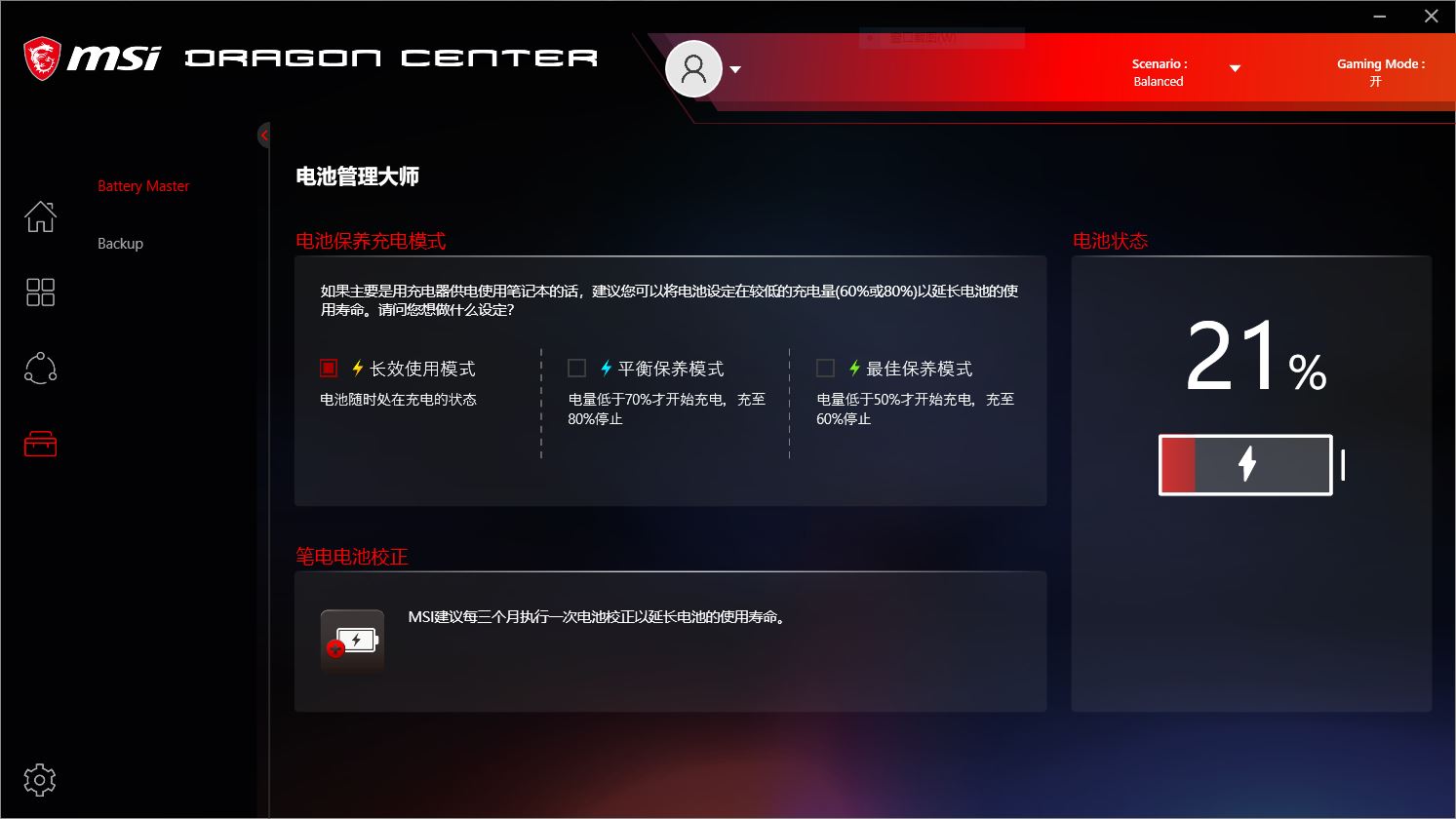 对Dragon Center或Creator Center内有支持电池管理大师*功能的MSI笔记本,当接上电源供应器充电时,可能会遇到电池仅能充电到特定容量或是无法完全充电到100%