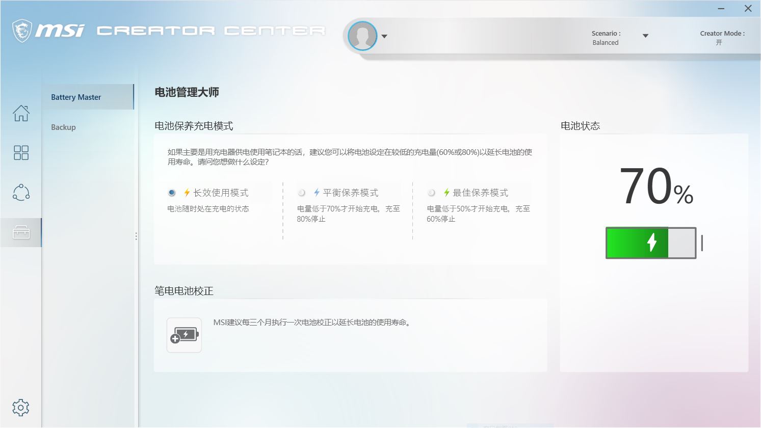 *电池管理大师是MSI Dragon Center(龙中心)/Creator Center(创作者中心)软件中的一项功能,提供三种电池充电选项可让用户根据不同的偏好进行调整。(设定画面可参考附图)