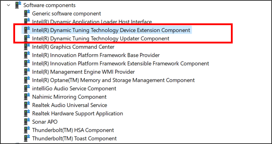 5. 在"软件组件"下找到 Dynamic Tuning Technology Device Extension Component & Dynamic Tuning Technology Updater Component
