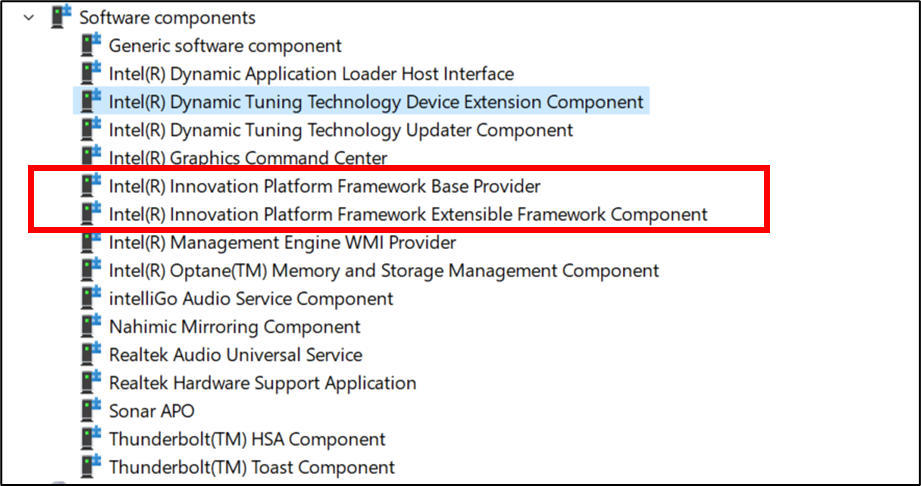 7. 同样在"软件组件"位置找到Intel Innovation Platform Framework Base Provider & Intel Innovation Platform Framework Extensible Framework Component